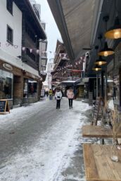 We took in the quaint town’s sights as we made our way to the train station to Matterhorn Sport, where we rented snowboards and helmets for 48.60 CHF/$50.86 each (we made sure to reserve them online ahead of time). We brought our own goggles which definitely came in handy and we highly recommend!