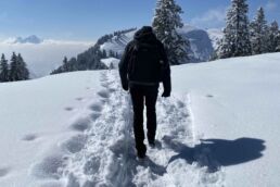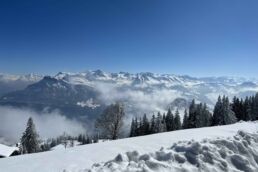 Next up: a hike on the Rigi Panorama Trail, reached via cable car from Kräbel. It cost more than we expected—about $100—but the panoramic mountain top views were worth every franc. With hardly anyone else on the trail and fresh snow underfoot, it felt like we had the Alps to ourselves. We both agree this is one our favorite hikes we’ve done to date, and certainly one of the most beautiful. We were not about to completely finish the trail due to the depth of snow, but it was funny giving it a try!
