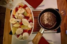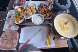 At dinner we enjoyed an indulgent three-course meal with bread and apples for appetizers, then potatoes, vegetables, rice, chicken and steak for the main course, and finally fruit with chocolate fondue for dessert. It was certainly a romantic dinner with a view of the Reuss, all coming in at $170.